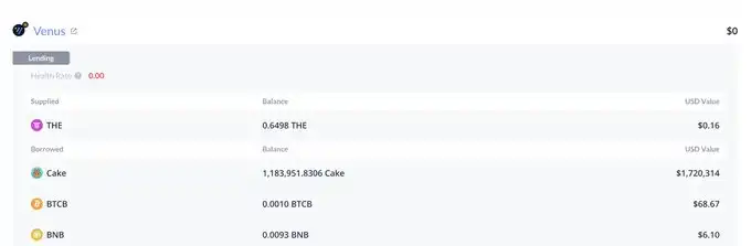 Venus 的约 2M 坏账地址:https://debank.com/profile/0x1a35bd28efd46cfc46c2136f878777d69ae16231