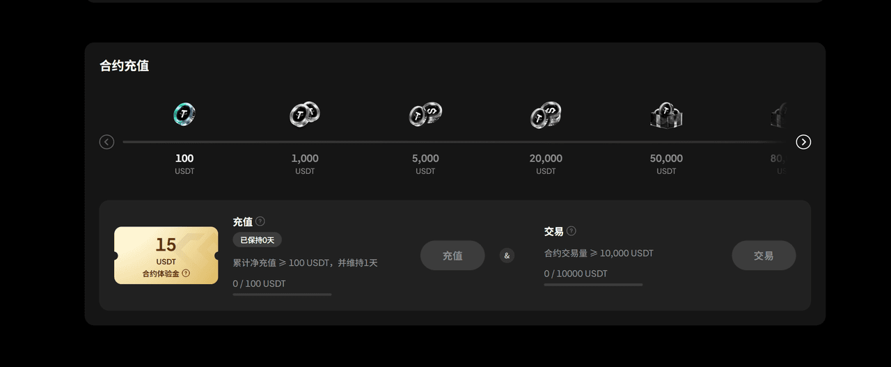 2)任意币种合约交易量 ≥ 1,000 USDT,即可获得 5~25 USDT 现金 + 5~10 USDT 体验金,交易量越大奖励越多。
