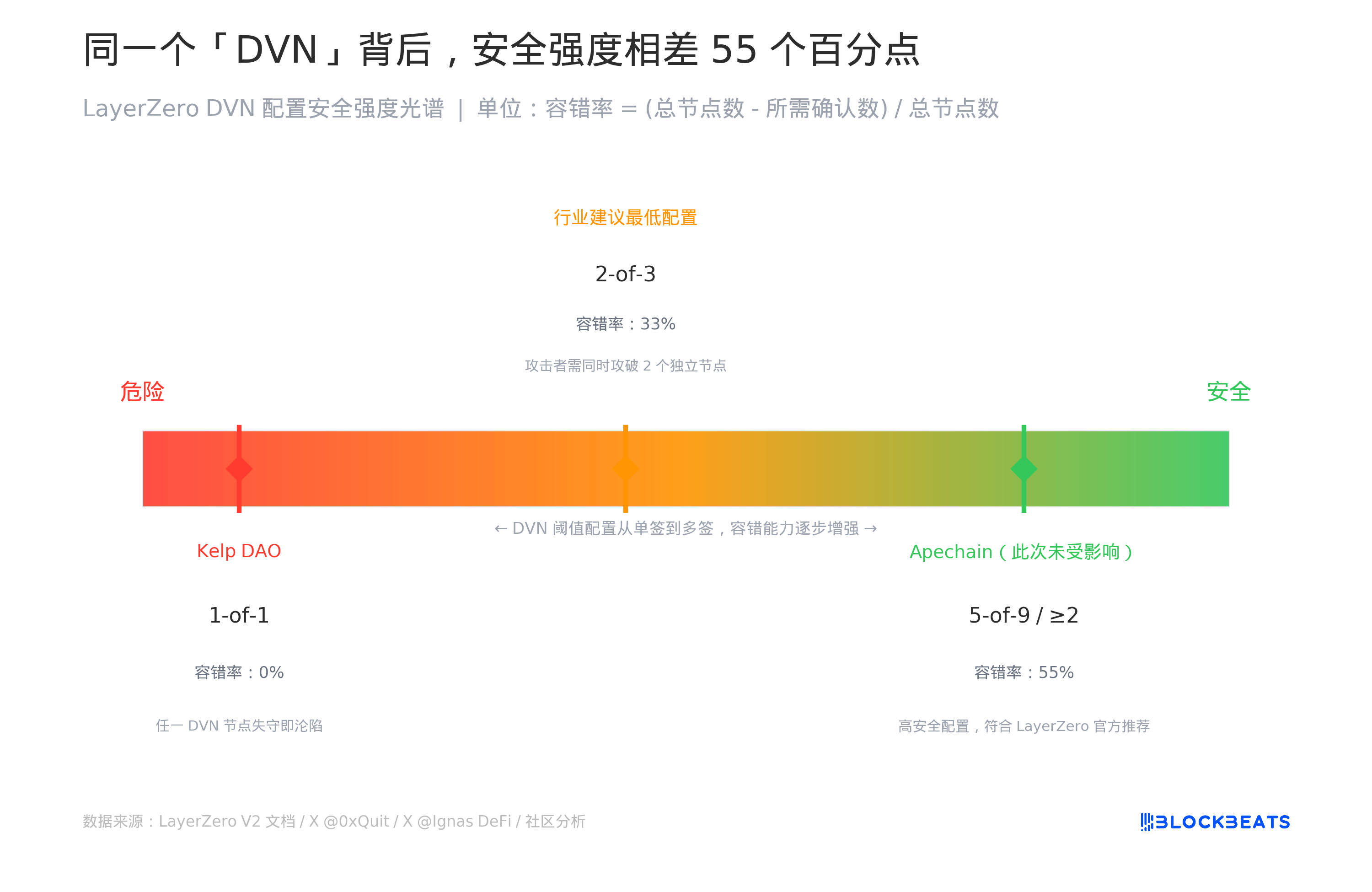 正常的行業建議是至少 2-of-3,攻擊者需要同時攻破兩個獨立的 DVN 節點才能偽造消息,容錯率提升到 33%。高安全性配置如 5-of-9,容錯率可以到 55%。