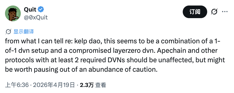 但有一件事讓這次攻擊區別於大多數駭客事件。Kelp DAO 的智能合約代碼沒有任何漏洞。參與調查的安全研究員 @0xQuit 在 X 上寫道,「從我目前掌握的情況來看,這是兩個問題的疊加:1-of-1 的 DVN 配置,以及 DVN 節點本身被攻破。」LayerZero 官方在聲明中也沒有提合約代碼,把問題定性為「rsETH 漏洞」而非「LayerZero 漏洞」。