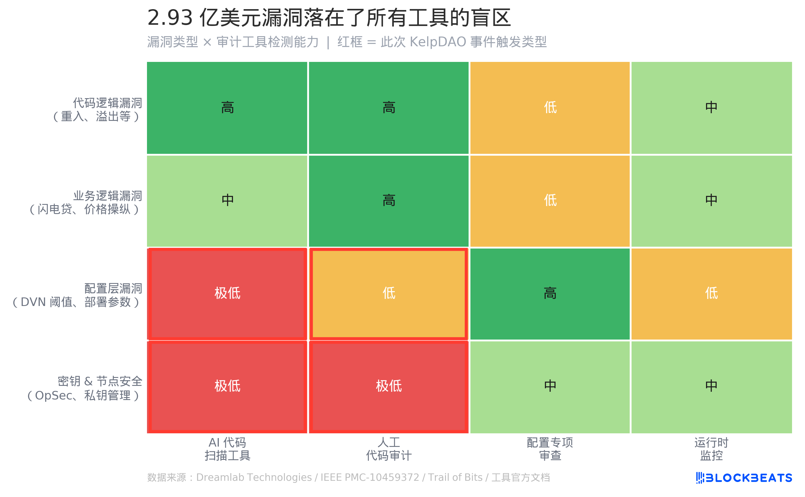 同樣在紅色區域裡的是密鑰和節點安全。@0xQuit 的描述裡提到 DVN 節點「被攻破」,這屬於運營安全(OpSec)範疇,超出任何靜態分析工具的檢測邊界。無論是哪家一線審計機構還是 AI 掃描工具,都沒有能力預測一個節點運營商的私鑰是否會被洩露。