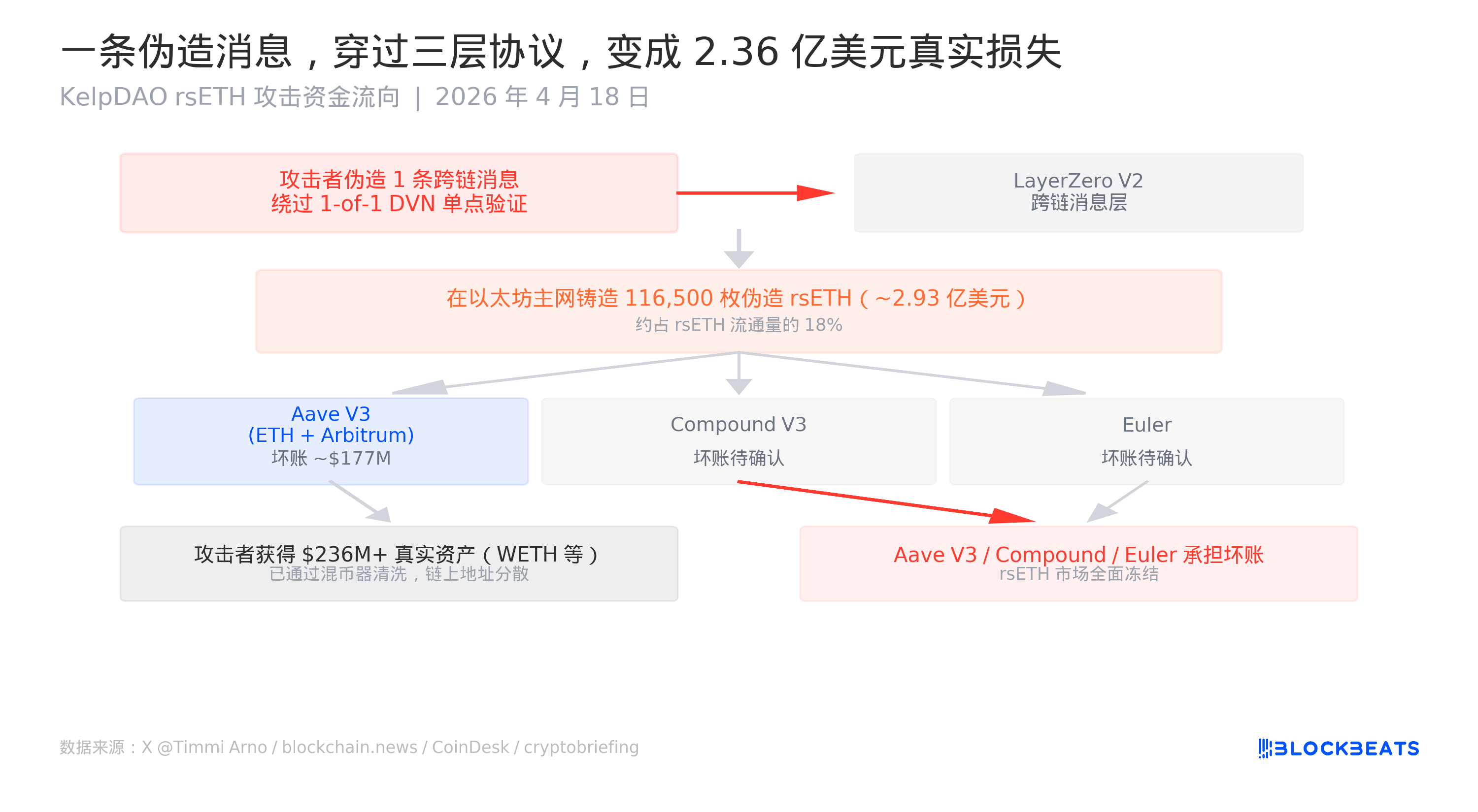 2026 年 4 月 18 日,Kelp DAO 的流動性再質押協議在幾個小時內被攻擊者從跨鏈橋裡抽走了 116,500 枚 rsETH,按當時價格約合 2.93 億美元。整個流程高效得有點反常,從偽造跨鏈消息到把贓款分散在 Aave V3、Compound V3 和 Euler 三個借貸協議裡借出真實資產,攻擊者在當天就帶著 2.36 億美元的 WETH 撤場了。Aave、SparkLend、Fluid 隨即全面凍結 rsETH 市場。