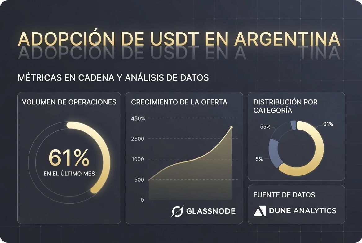 USDT es una stablecoin, básicamente una criptomoneda diseñada para mantener un valor estable, con paridad uno a uno con el dólar estadounidense. Emitida por Tether, su capitalización de mercado ya supera los $186 mil millones de dólares según las métricas on-chain más recientes. Lo fascinante del contexto argentino es que el 61% del volumen cripto en nuestro país está en stablecoins como USDT, y no es casualidad: las usamos para combatir la devaluación del peso, enviar y recibir remesas sin pasar por el sistema bancario tradicional, y hasta para hacer compras cotidianas evitando las complicaciones impositivas que todos conocemos.