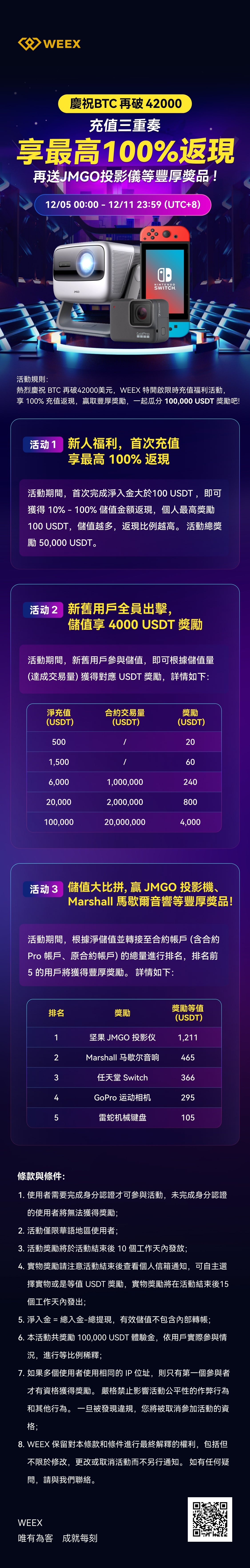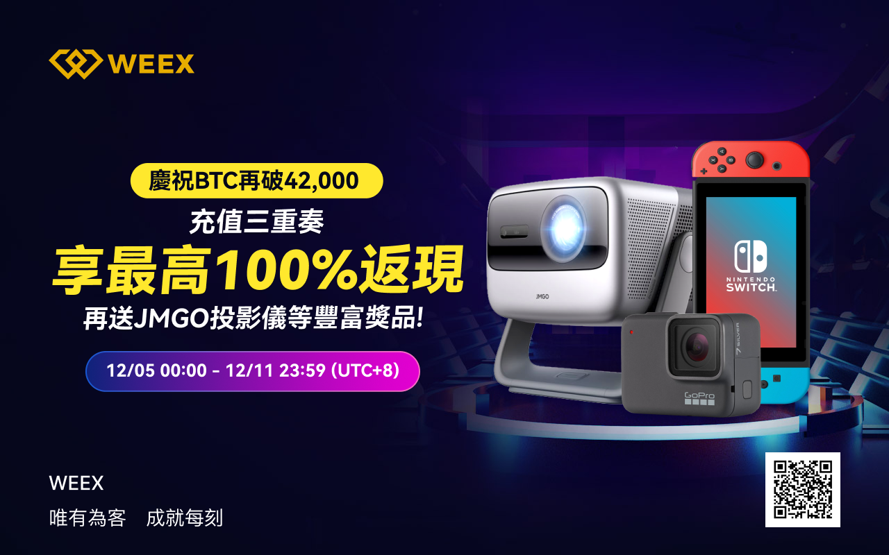 熱烈慶祝BTC再破4.2萬美元,WEEX特開啟限時充值福利活動,享100%充值返現,贏豐厚獎勵,一起瓜分100,000 USDT 獎勵吧!