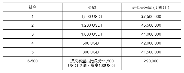 2.交易量≥90,000按交易量佔瓜分獎池,最高獎勵1,500USDT;