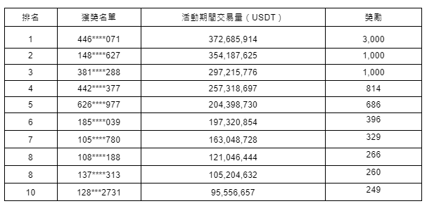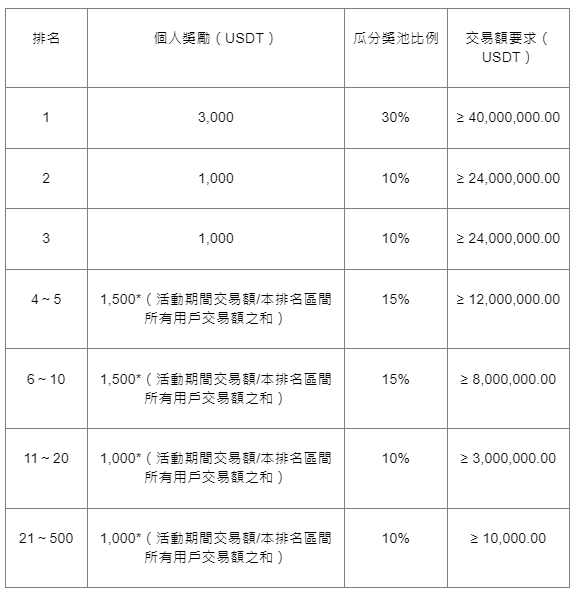 活動僅計算20倍杠桿以上交易,排行榜獎勵規則如下: