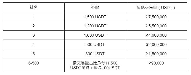 2.交易量≥90,000按交易量占比瓜分獎池,最高獎勵1,500USDT;