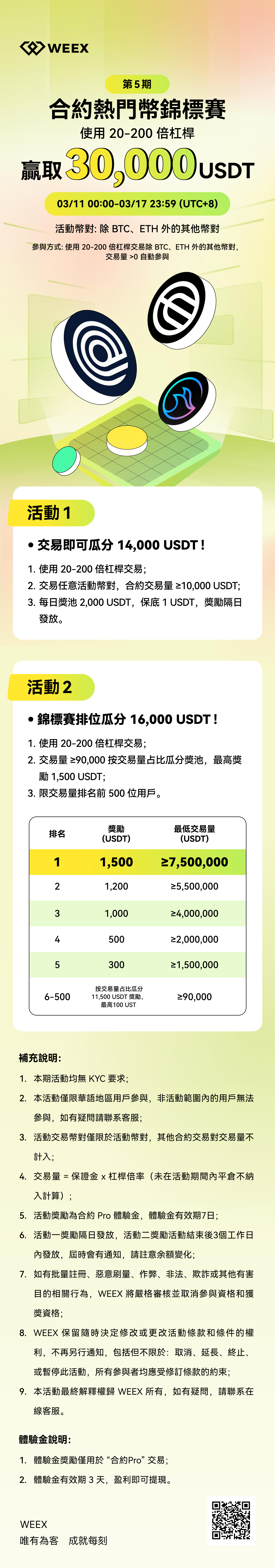 7.如有批量注冊、惡意刷量、作弊、非法、欺詐或其他有害目的相關行為,WEEX將嚴格審核並取消參與資格和獲獎資格;