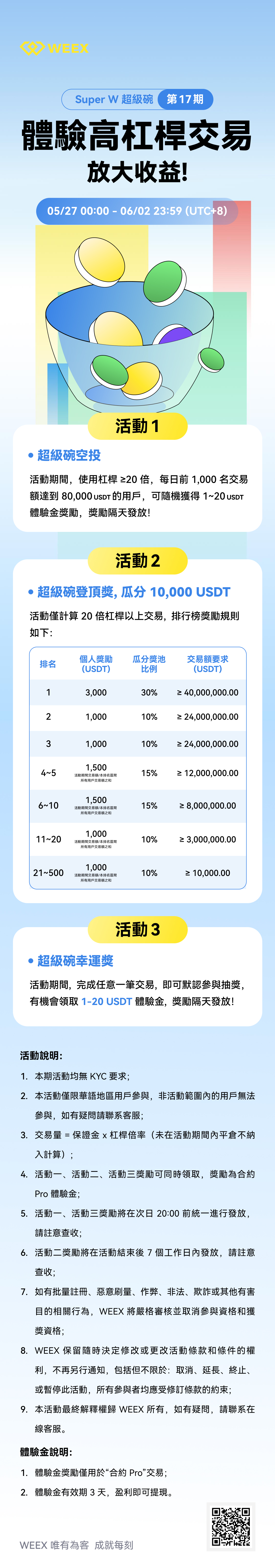 Super W超級盃第17期重磅來襲,WEEX帶您體驗高槓桿交易,放大收益,不要再錯過這次暴富的機會!還有超級幸運獎可以領!快來參與吧!