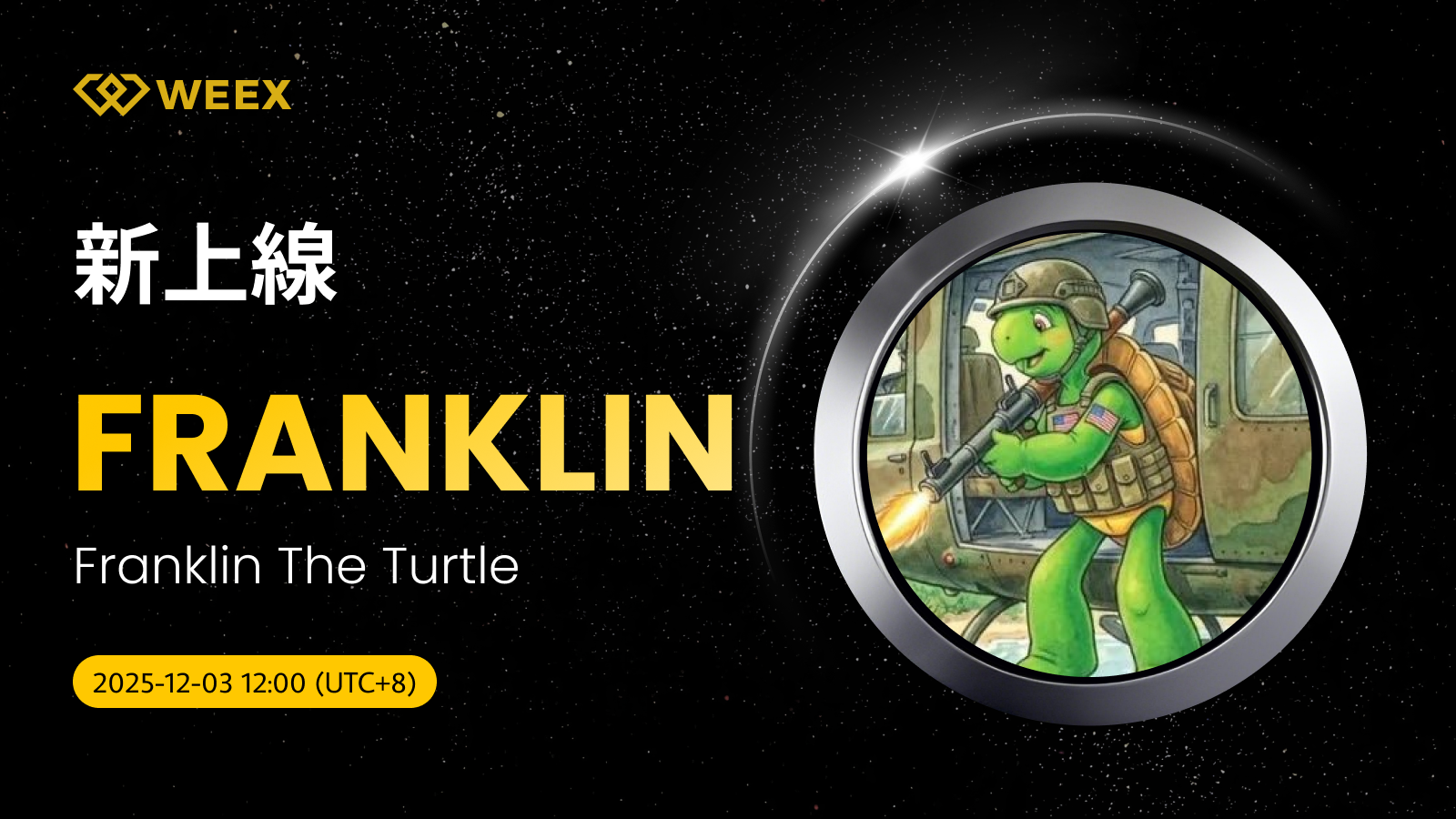 Franklin代幣源自@FranklineOnSol關於經典兒童角色Franklin The Turtle武裝冒險的推文,背景是這只可愛烏龜被改編成勇敢戰士,象徵著從童話到戰場的趣味轉變,其標誌展示了微笑的綠龜身穿迷彩軍服、手持槍械從直升機躍出,背景是水面和熱帶叢林。